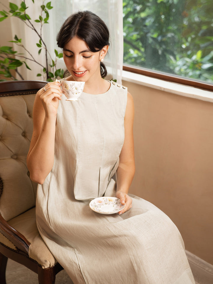 Floral linen dress. fresh and natural. gentle like the breeze. offering a relaxed. healing feeling as if immersed in a garden. Perfectly embodies comf..